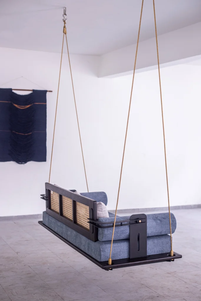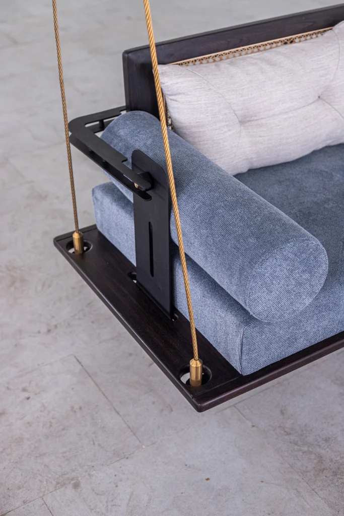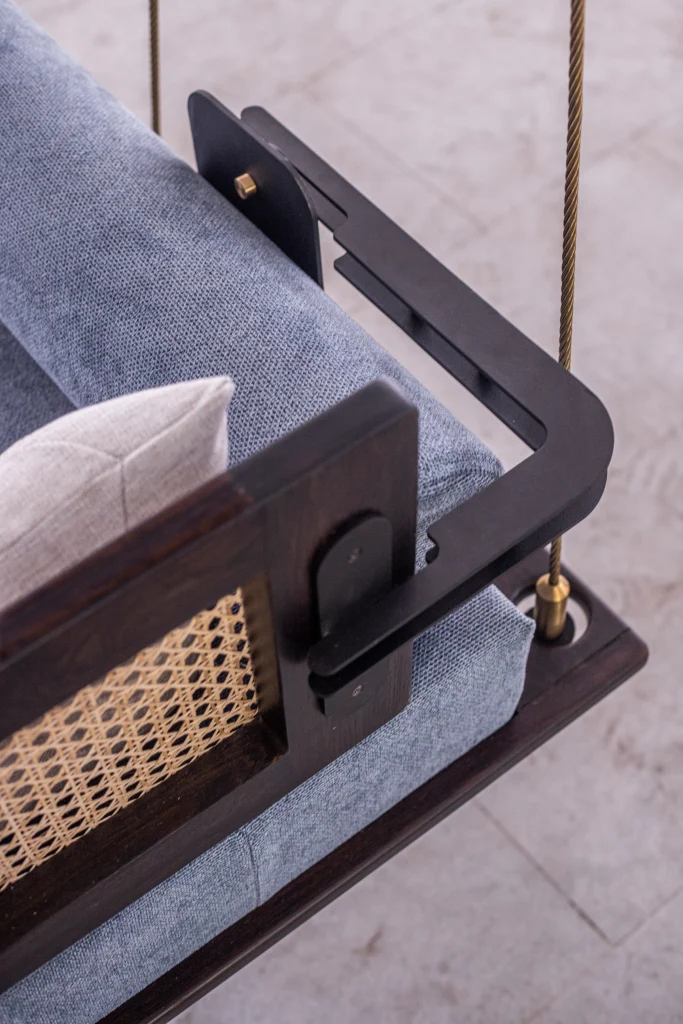 This luxurious swing boasts attention to detail, vintage charm, and modern form. Its cane weaving and